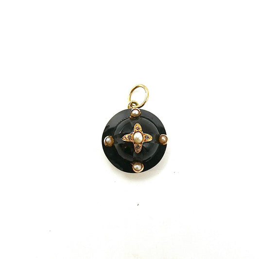 An Antique onyx, pearl and diamond pendant, a victorian mourning pendant.