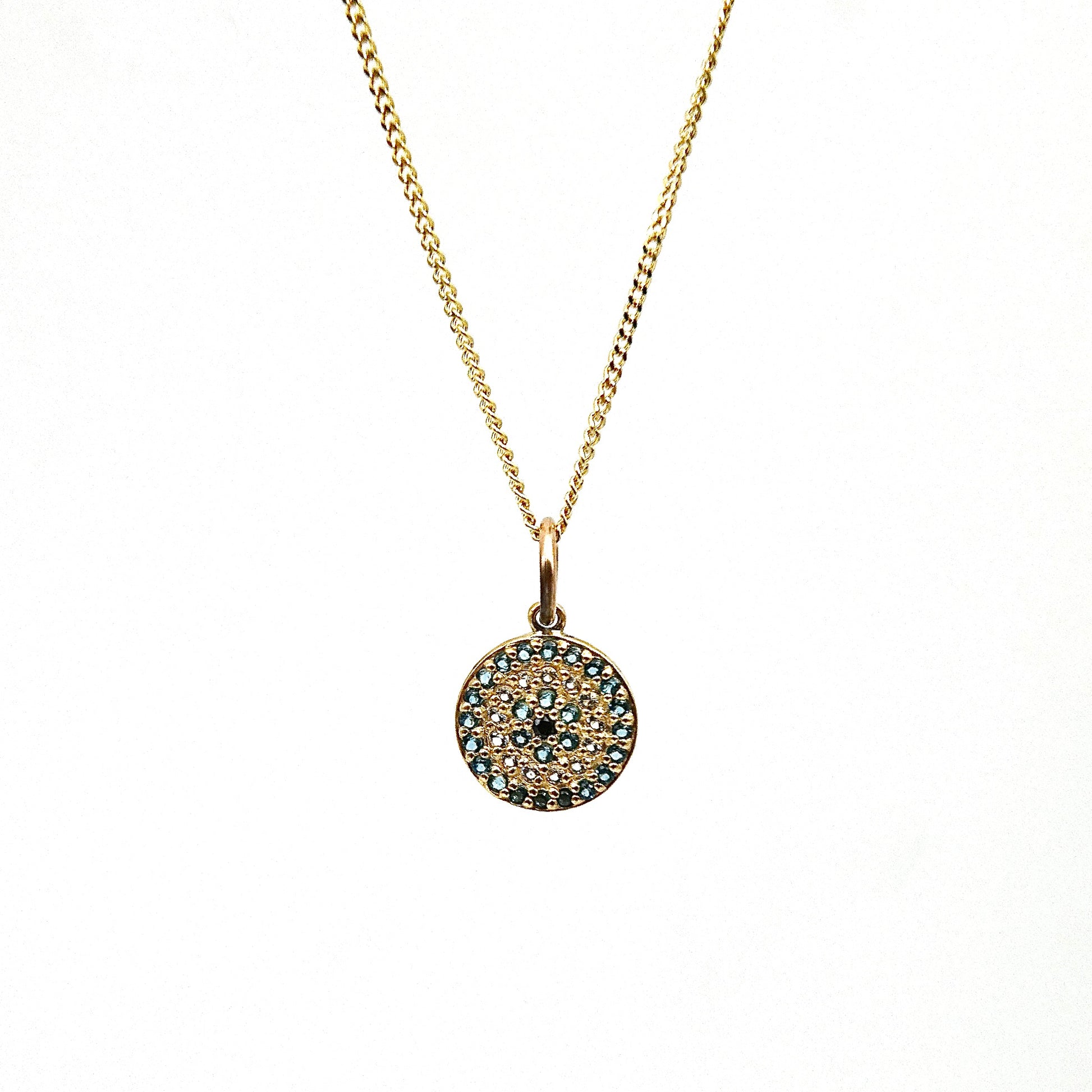 The Evil Eye is an ancient protective symbol or amulet. This 11mm circular pendant is set with Spinel, topaz and London Blue topaz Gemstones.