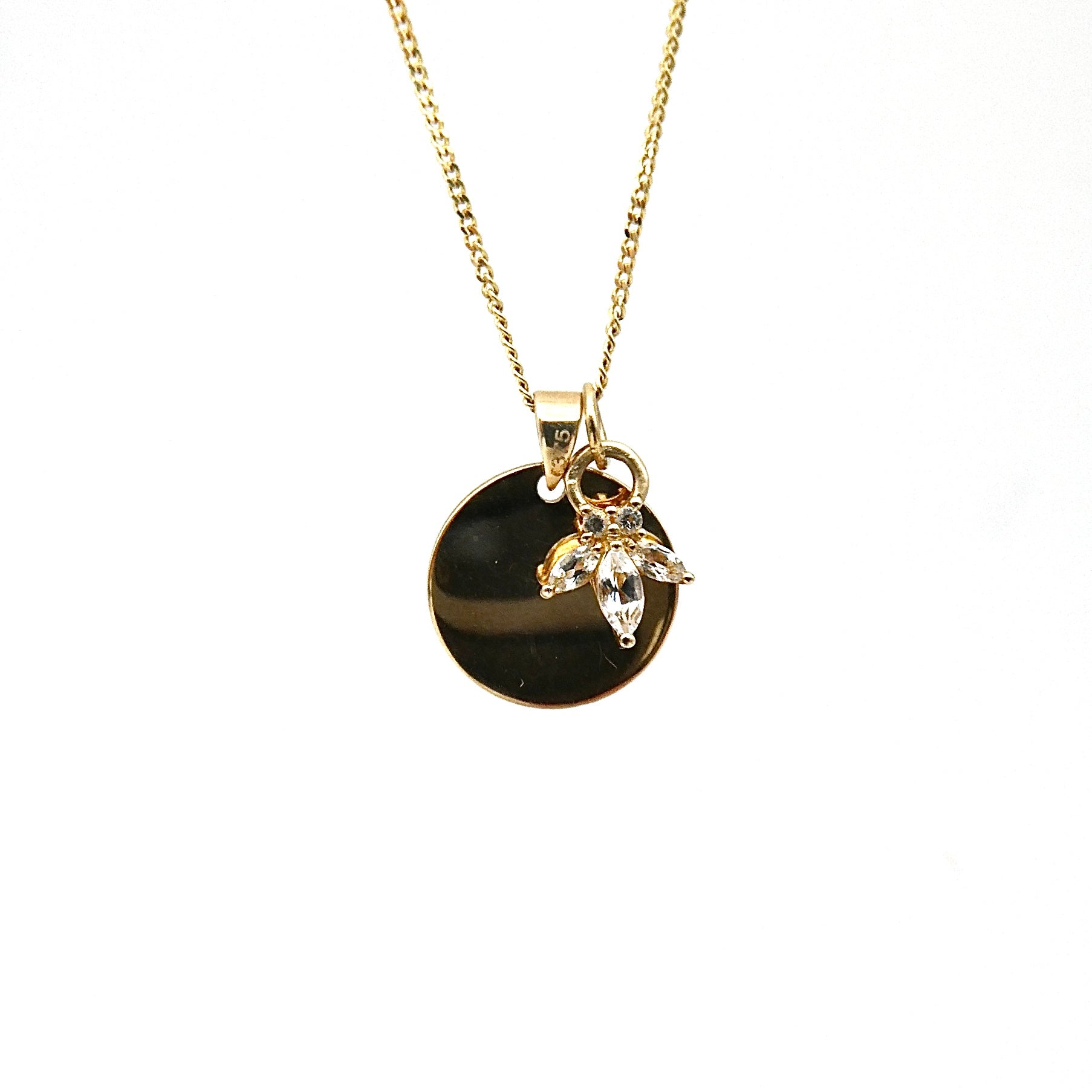 Gold Disc Pendant with a 9kt gold and white Topaz charm