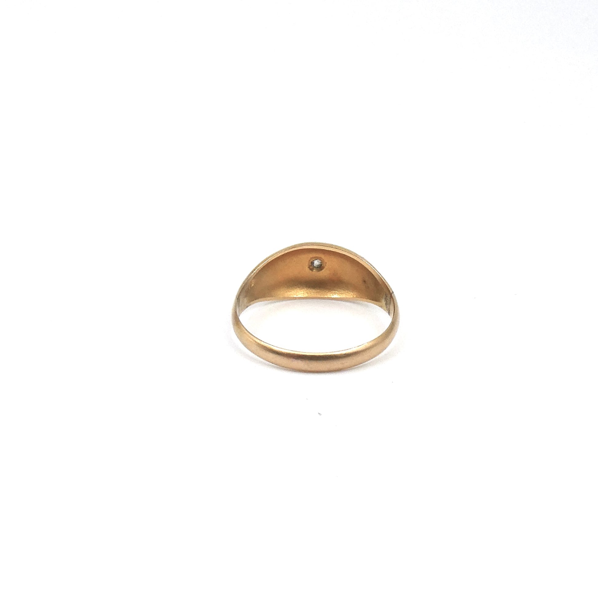 The ring is hallmarked Birmingham 9kt gold and a date letter for 1907. It is set with a tiny uneven rose cut diamond and chips on either side set in stars. Ring is size O/7 and the weight is 2.8 grams. There is an unusual matt appearance to the gold.