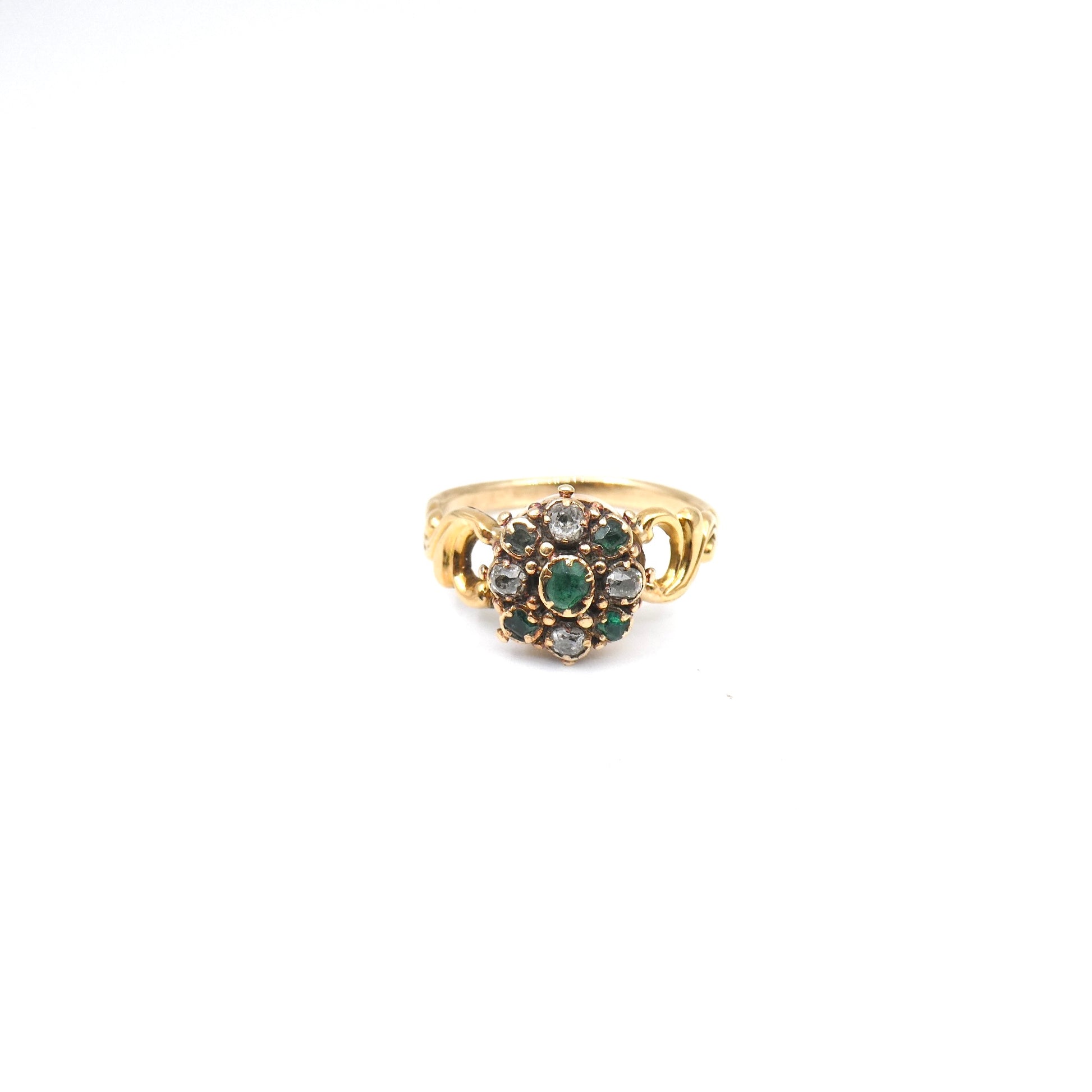 The cluster is made up of five faceted emeralds, one in the centre and four x 3mmm surrounding with old cut diamonds between them. The centre emerald is c. 3mm and the others 1.5 mm. They are held in place with gold claws and small beadwork with scrolled shoulders leading to the band. The gold tests 8-9kt gold. Ring is size 6.25, M. weight is 2.8 grams. No hallmarks present common with antique pieces but in keeping with Victorian Pieces.