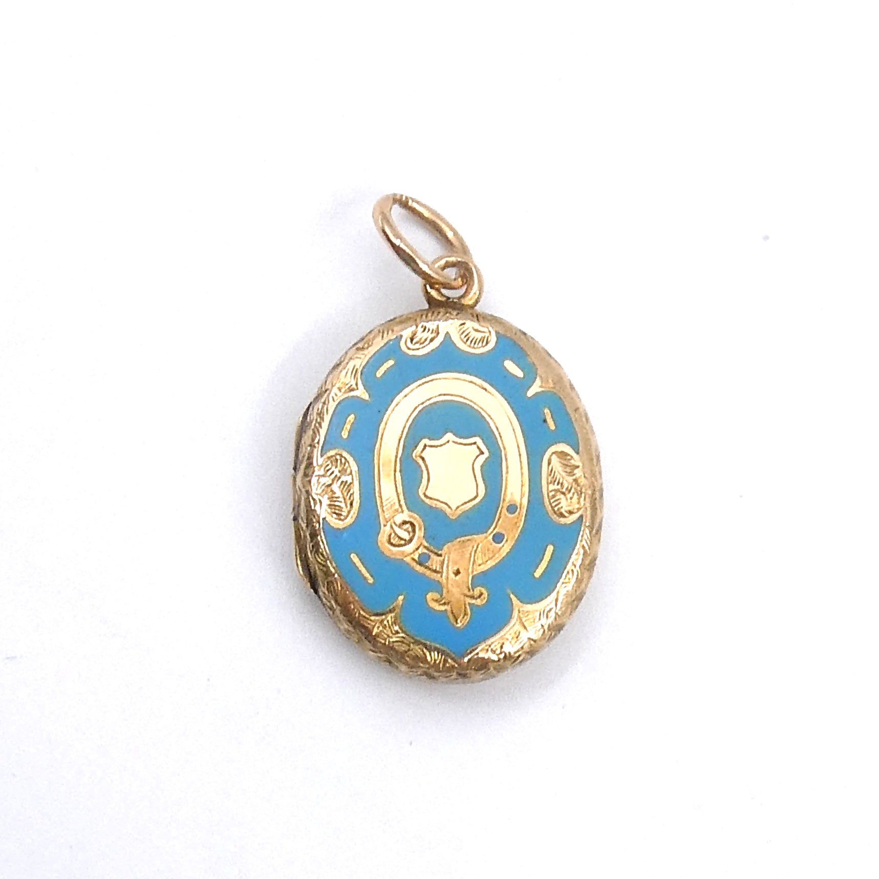 Antique Enamel Locket with blue enamel, within a victorian pattern of a belt & shield