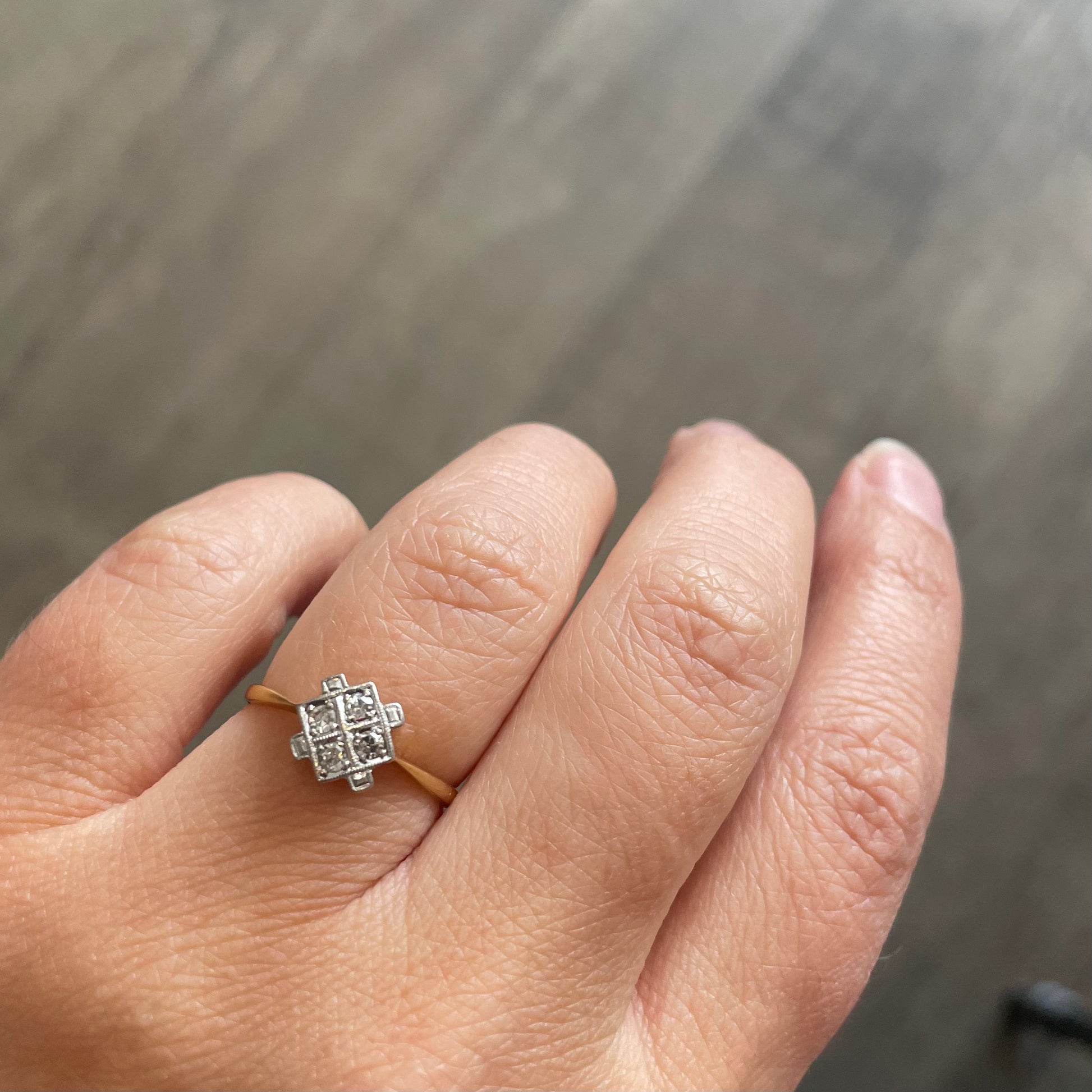 Mini Art deco ring, pretty geometric diamond, gold and platinum ring. A lovely antique promise ring or vintage gift. There is a lovely sparkle from the diamonds.
