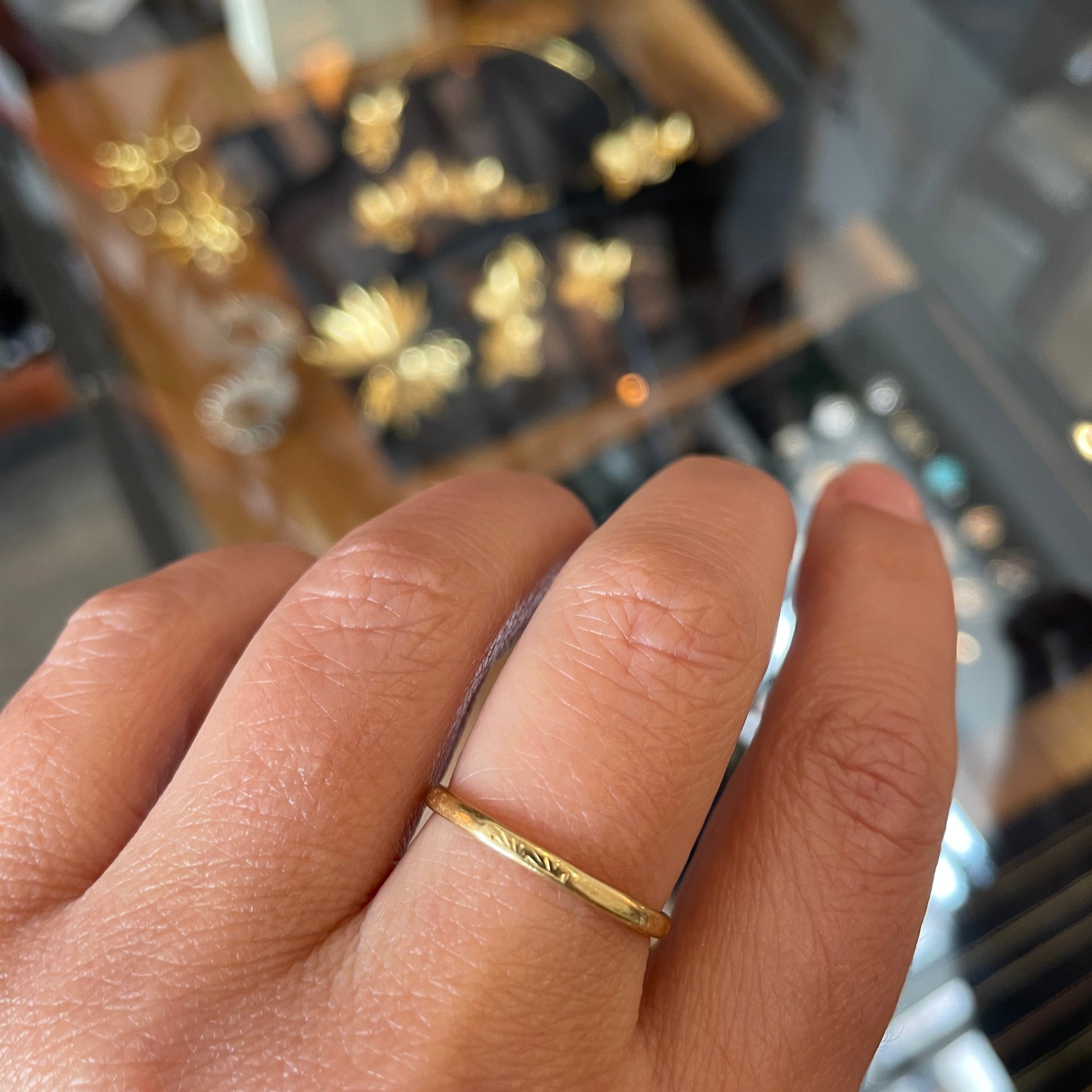A beautiful 18kt gold fine ring with engraved detailing on five of its ten faces The band has the rich gold colour of high carat rings. A true vintage treasure perfect for a vintage stack.