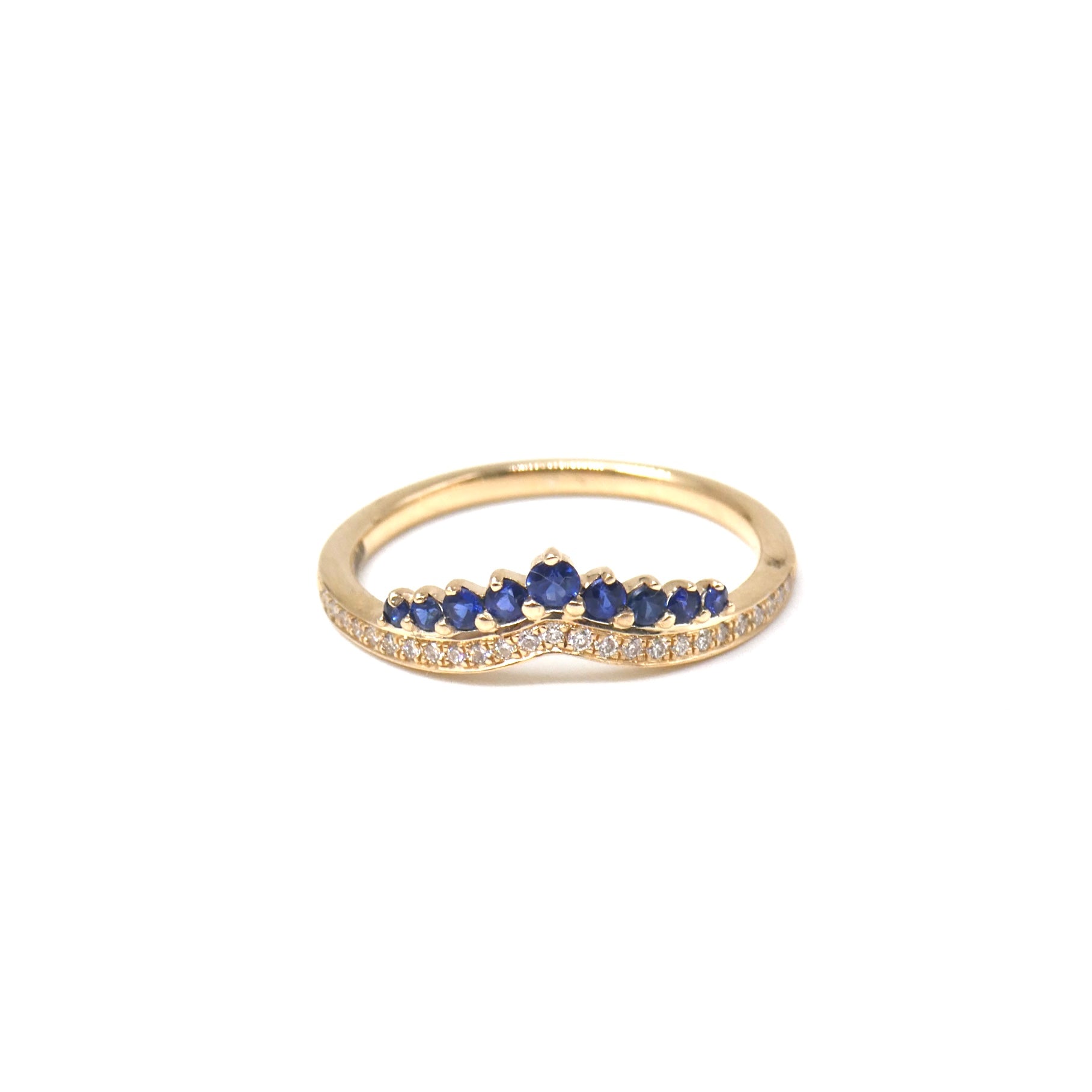 A curved ring set with natural diamonds and graduating sizes of sapphires. Diamond quality is H SI carat weight .11ct. Blue Sapphire 0.27ct. Size M or 6.25.An incredibly versatile ring that can be worn on either side of a solitaire or cluster ring, or a straight band of diamonds. Re-inventing or complimenting another ring.