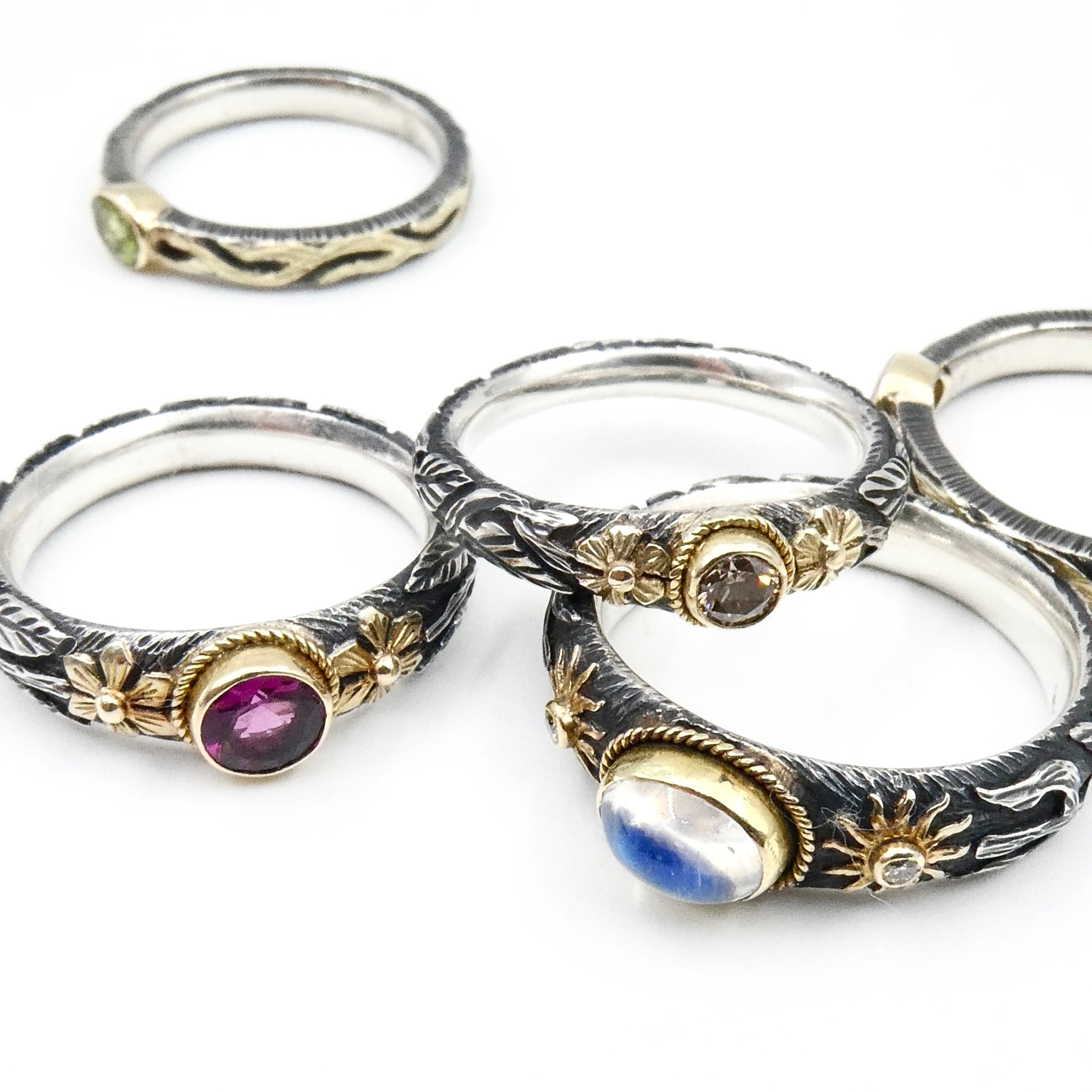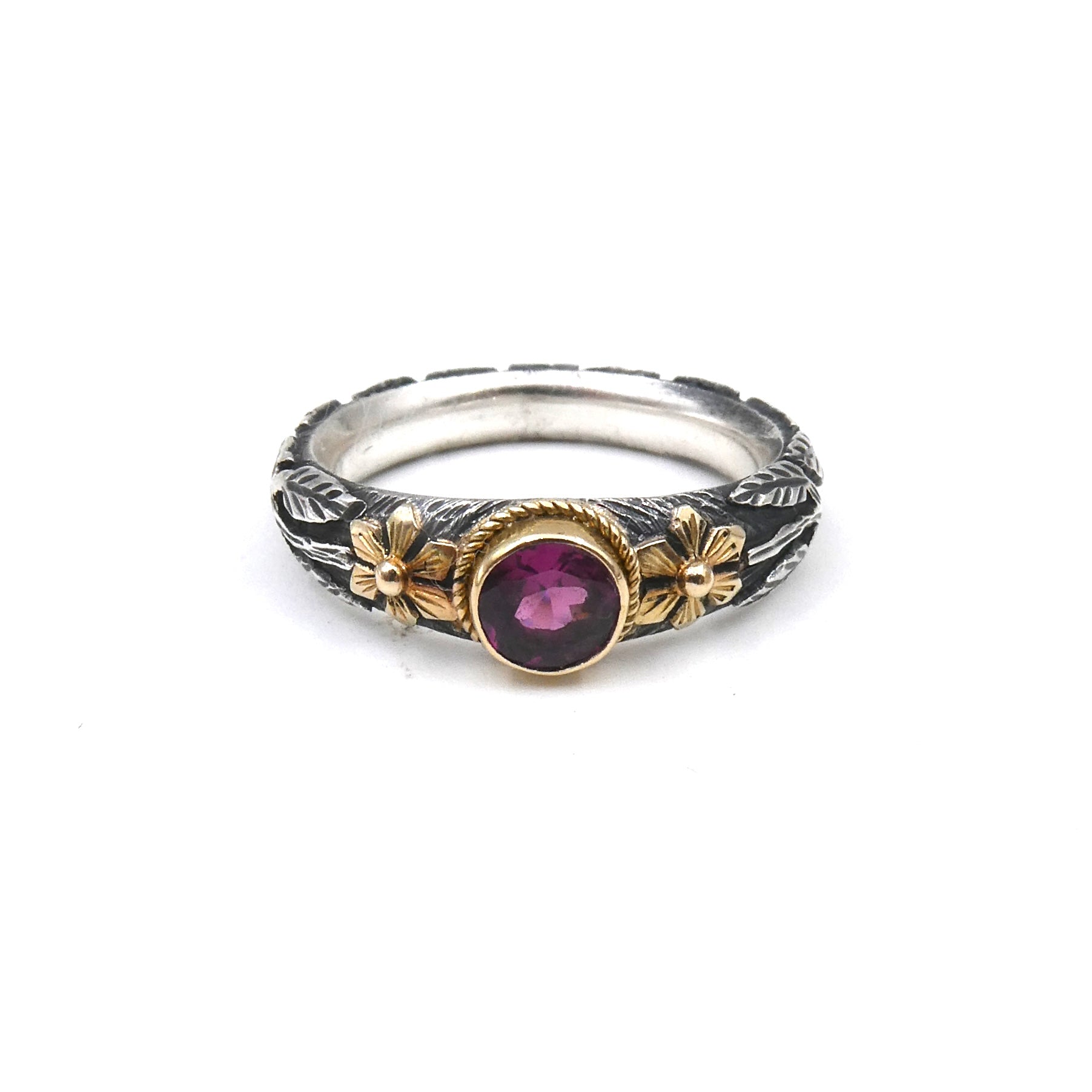 Exquisitely made and engraved ring set with a Rhodolite Garnet Designed by Rajvi Vora of Kastur Jewels in Marylebone London and Made by artists in Rajasthan.