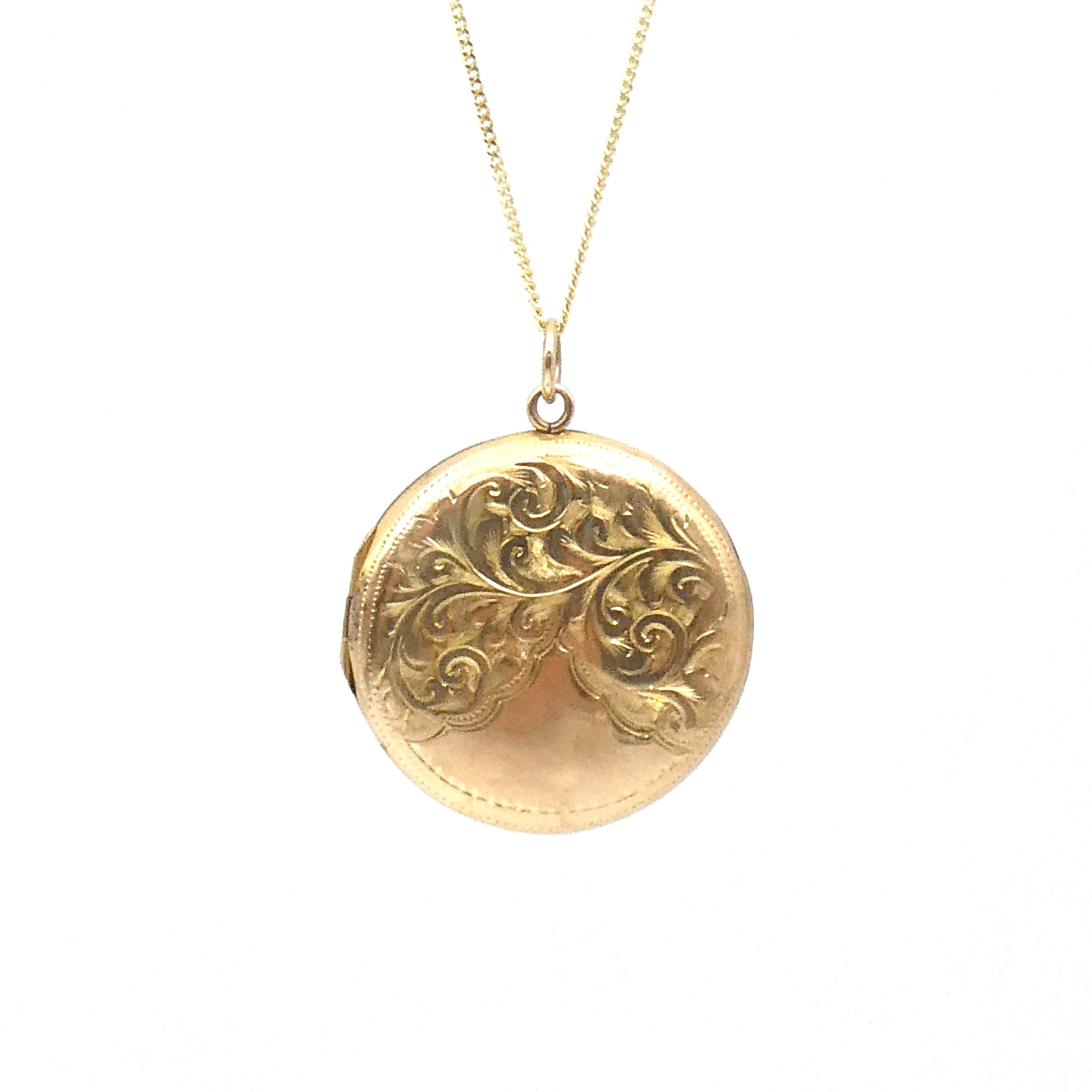 A large round victorian gold back and front locket with engraved scroll foliate design on the back and the front.