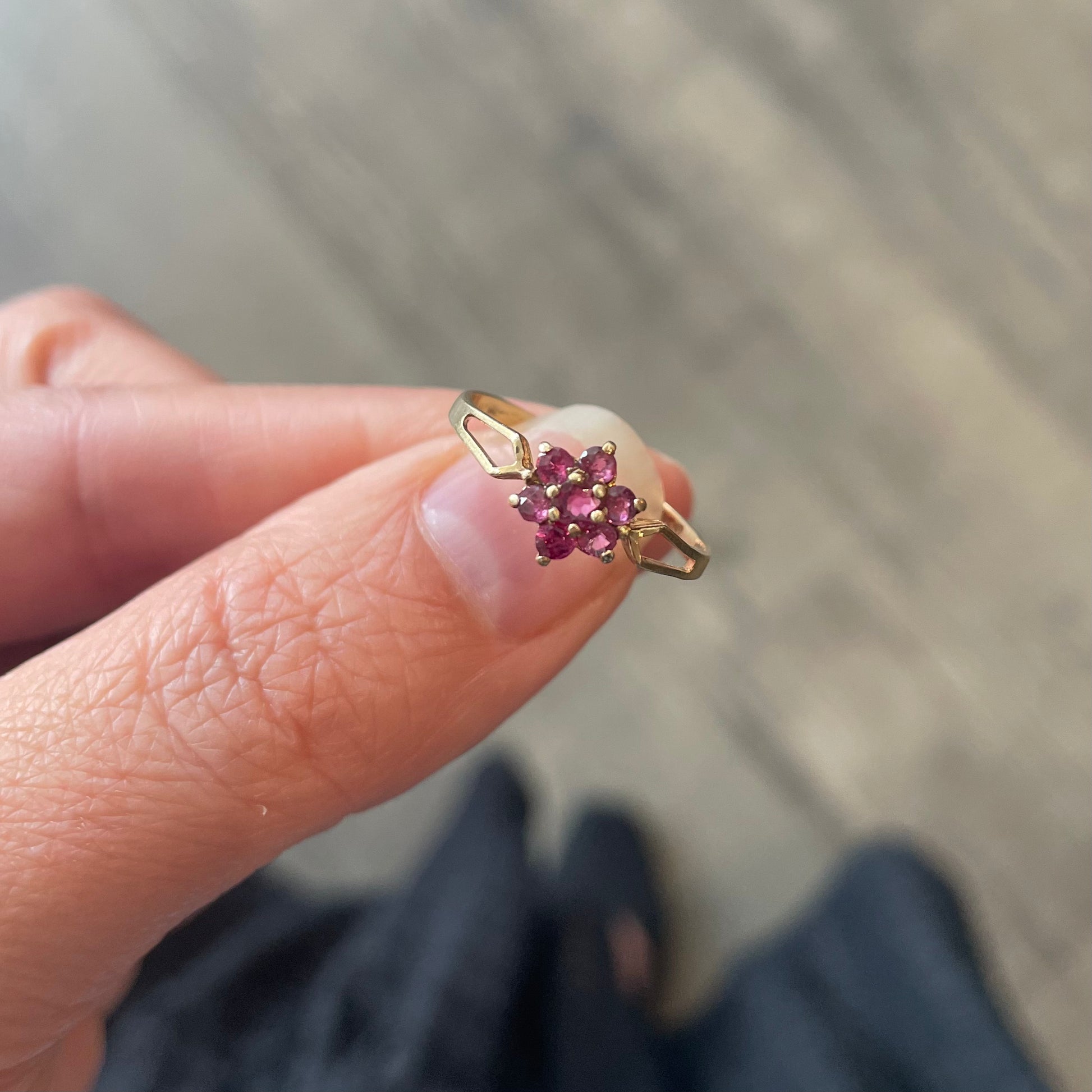 A ruby flower cluster ring, a pretty delicate ring in 9 ct gold. This lovely little ring has seven pink rubies that are a lovely deep colour. The shoulders have an open design adding a delicacy to the ring.