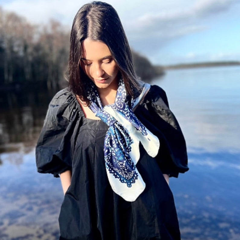 Luxurious 100% silk-twill scarf with delicate rolled hem. Hand-drawn paisley lace motifs create a deep, decorative border inspired by the designs from the original Irish/Galway shawls.