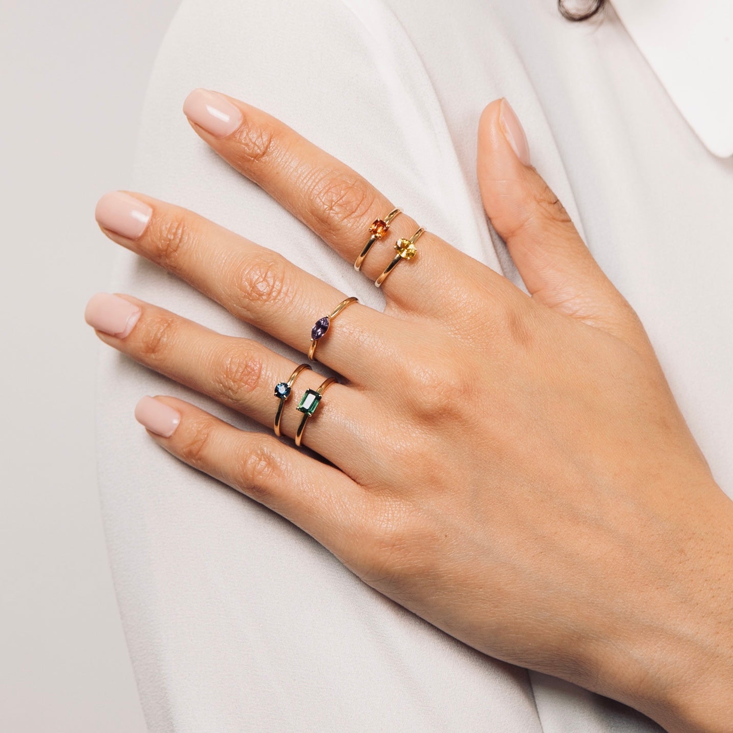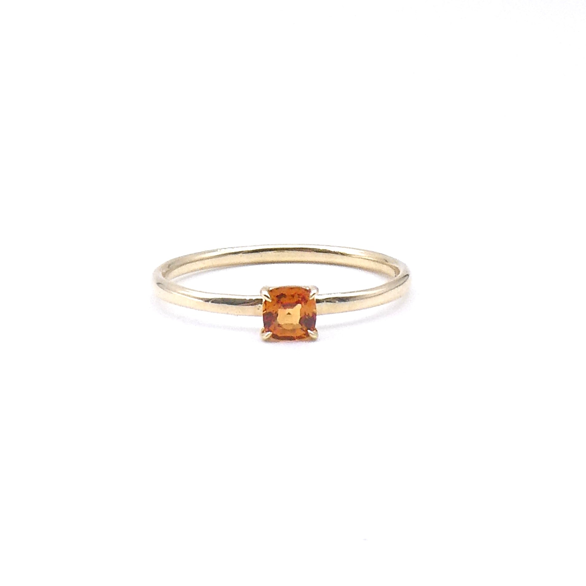 A bright tangerine sapphire ring, a cushion cut stone set in four claws on a 9kt gold band, lovely ring solo or stacked with other rings.