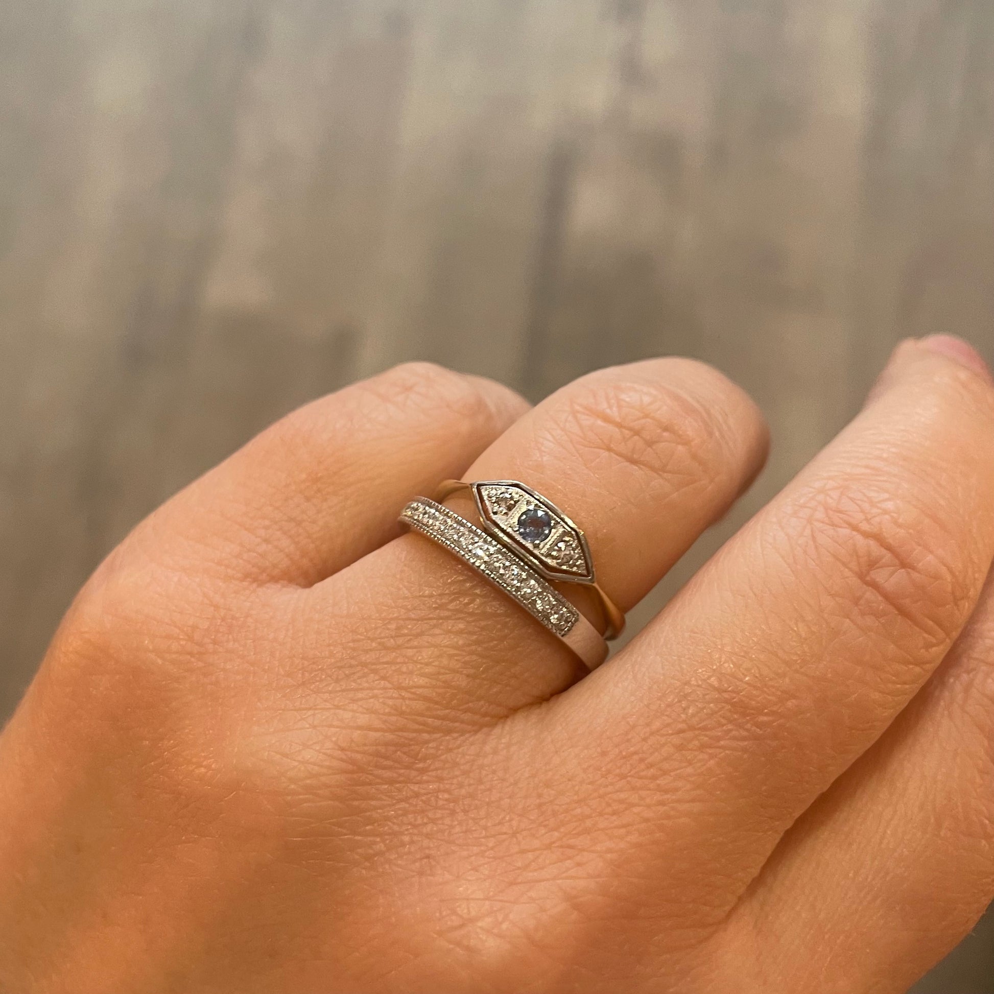 - Set with 2.3mm cornflower blue sapphire and 2x tiny 1mm flat diamonds